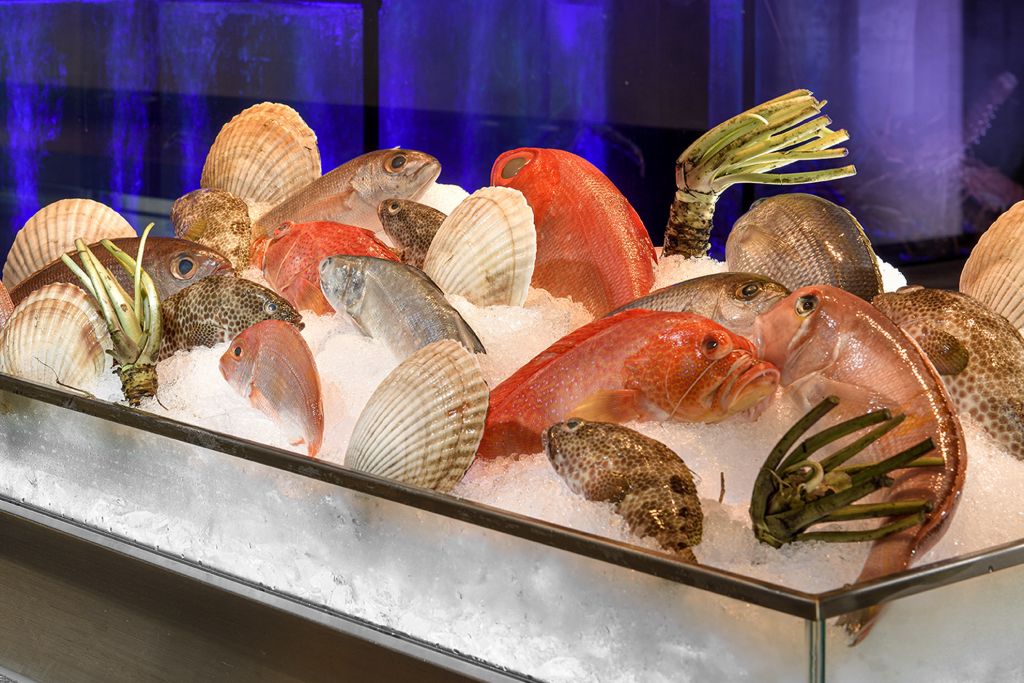 甫入岩彩3.1公尺長大面水缸映入眼簾,裡頭有帝王蟹、象拔蚌、沙公等頂級食材,水缸採嚴格控溫、分區照料方式,確保活體海鮮品質。餐廳亦規劃海鮮檯,每日有超過20種現流、活體海鮮輪番上陣,有機會品嘗到珍稀海味,春夏時節推薦野生角魚、那個魚(小鰭鐮齒魚)及青雞。