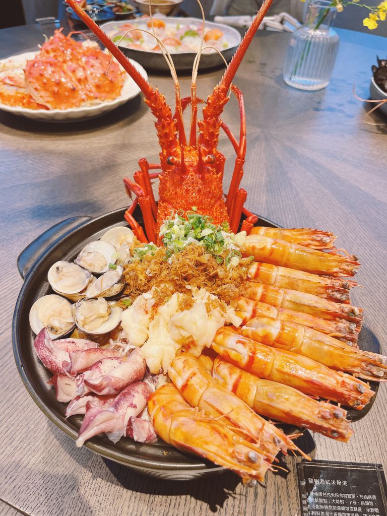 主廚發揮創意將在地小吃米粉湯完美升級,「龍蝦海鮮米粉湯」以紅蔥頭、香菇、蝦米搭配輕烤後的龍蝦殼、豬骨及魚骨一同煨煮,加入柴魚、洋蔥、紅蘿蔔與白蘿蔔增加甘甜味,滴入宜蘭在地紅露酒提鮮,加入澳洲龍蝦、牛奶貝、虎蝦與小卷等豐富海鮮,搭配吸滿海鮮精華的宜蘭在地米粉,令人唇齒留香。