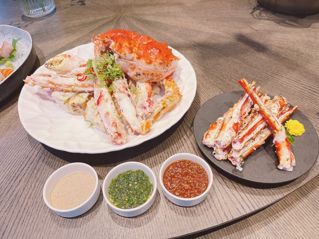「北海道帝王蟹兩吃」以清蒸與碳烤烹飪手法保留蟹肉清甜,搭配主廚特製芥末椒鹽與蒜蓉醬等調味,享受鮮甜的海鮮風味。
