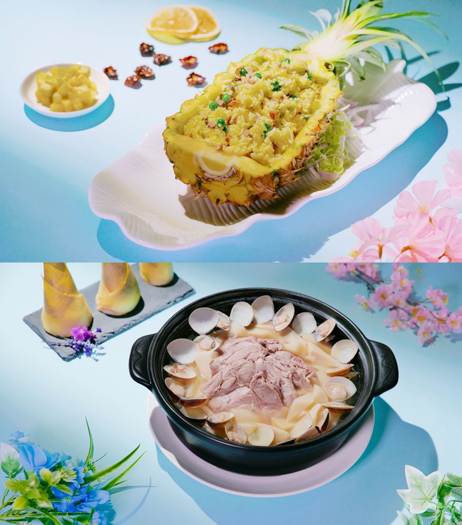 立軒中餐廳將梨、竹筍、鳳梨點綴肉品的鮮甜,推出5鹹2甜主廚創意料理。主廚伍師傅循粵菜老火湯古法煲湯,提煉金華火腿、赤肉等食材原香,嚴選仿土大雞腿、蛤蜊入料,解熱氣,讓喝湯不再是冬季專屬。搭配以正宗粵式炒飯手法,將金鑽鳯梨果肉拌炒粵式燒臘烤鴨肉丁,金黃蛋液包覆每顆米粒的火鴨菠蘿炒飯。
