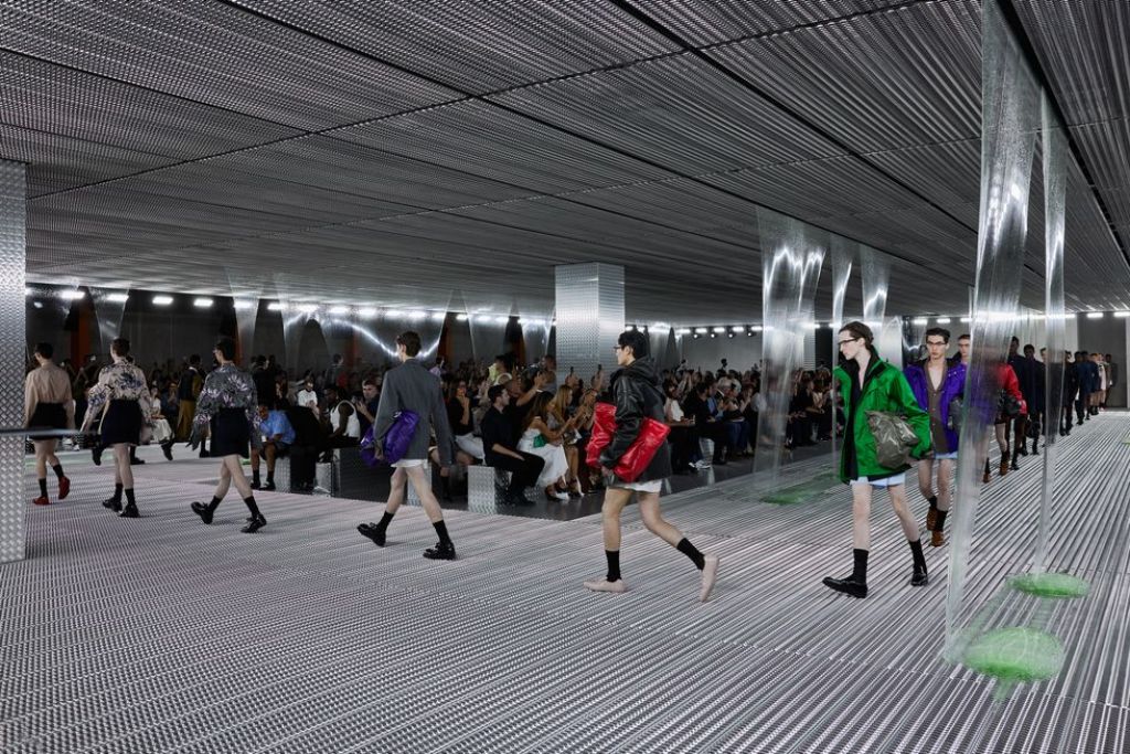 由Miuccia Prada女士與Raf Simons兩位設計師打造的PRADA 2024春夏男裝時裝秀,如一座實驗性流動建築環繞著人們。經由服裝的基礎廓形延伸創作,詮釋身體極致的自由。