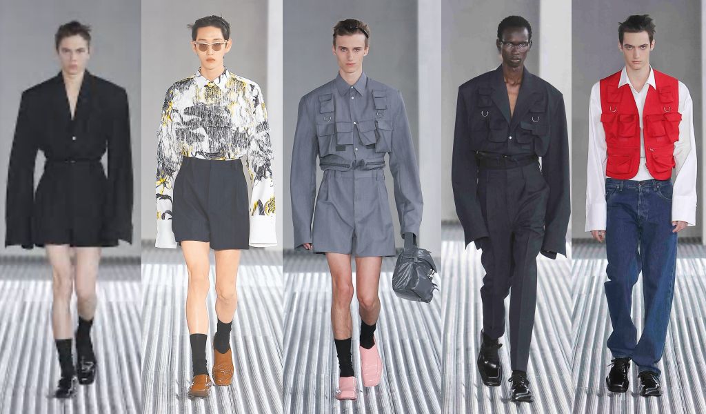 系列設計襯衫為核心,正式西裝、工裝背心、俐落風衣、機能防風外套皆以襯衫型態換新登場,保留既有輪廓,換上棉質面料、小型平底釦與方正衣領,採用針織並裝飾皮草,衣袖長度與短褲平行,隨步伐搖曳擺動。