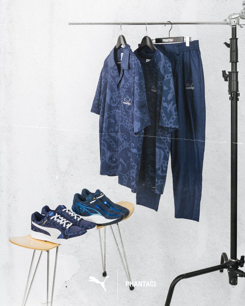 本季推出襯衫、短袖T恤及梭織長褲,運用滿印設計將極具巴洛克風格的玫瑰、星星等經典元素與鎖鏈狀花紋加飾於上衣單品;梭織長褲採用皇家藍配色,褲腿翻折處搭配同款印花圖紋設計與上裝呼應。每件服裝單品均有燙銀處理PHANTACi字樣與PUMA美洲獅LOGO組合印飾,於細節處彰顯兩者聯名內斂的奢華氣質。