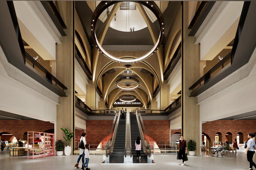蕭博文建築師將誠品生活新店打造成一座偌大立體城市,正中央以十字軸設計公共街道,透過一連串巨型拱門象徵橋樑連結B1~4樓,打造一條朝聖之道。搭乘手扶梯一路穿越沉著的紅磚、輕巧的木質,感受空間氛圍的細膩轉換,最終抵達朝聖終點4樓書店閱讀殿堂。