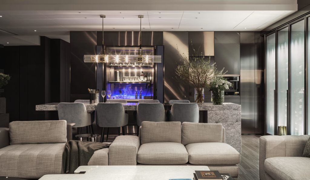 公寓訂製設計餐桌/酒吧兩用餐吧,呈現多樣休閒用餐體驗,帶黑色金屬飾面的訂製酒櫃展示業主對品酒的興趣。打開隱藏在精緻皮革面板後面的威士忌吧台,形成一個帶有低照明環境的豪華家庭酒吧,營造放鬆舒適的夜間氛圍。