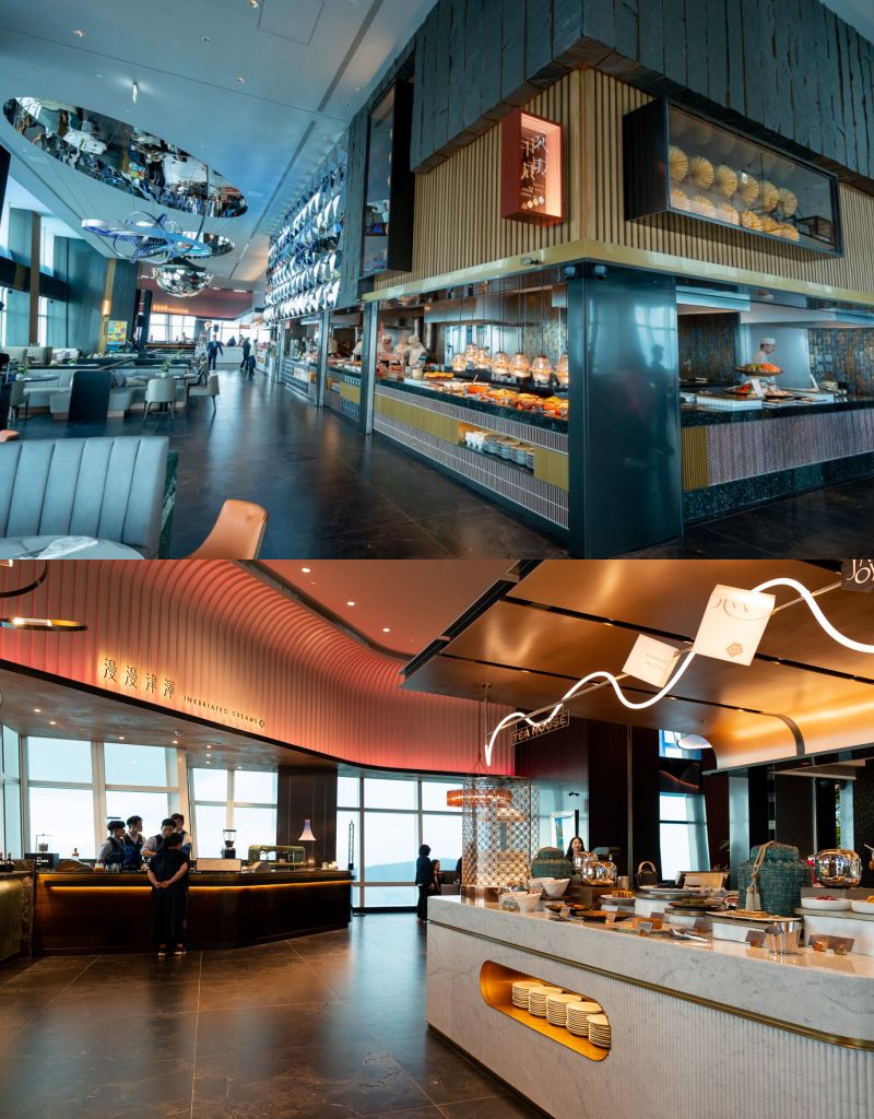 海境迎面大型藝術裝置”被海擁抱的存在”,傳遞受寒暖洋流環抱意象,彷彿置身蔚藍海底,天花板波浪與氣泡,湛藍流動於空間氛圍,”粼粼海之流”裝置藝術象徵海的旺盛豐饒。牆面金屬漸層鍍色有海平面曙光意象,”饗音樂”聆聽最台灣的日常聲景,伴隨粼粼波光意象,聆聽岸與潮交織出海洋基因裡最熟悉的旋律,品嚐台灣當令豐盛海味。