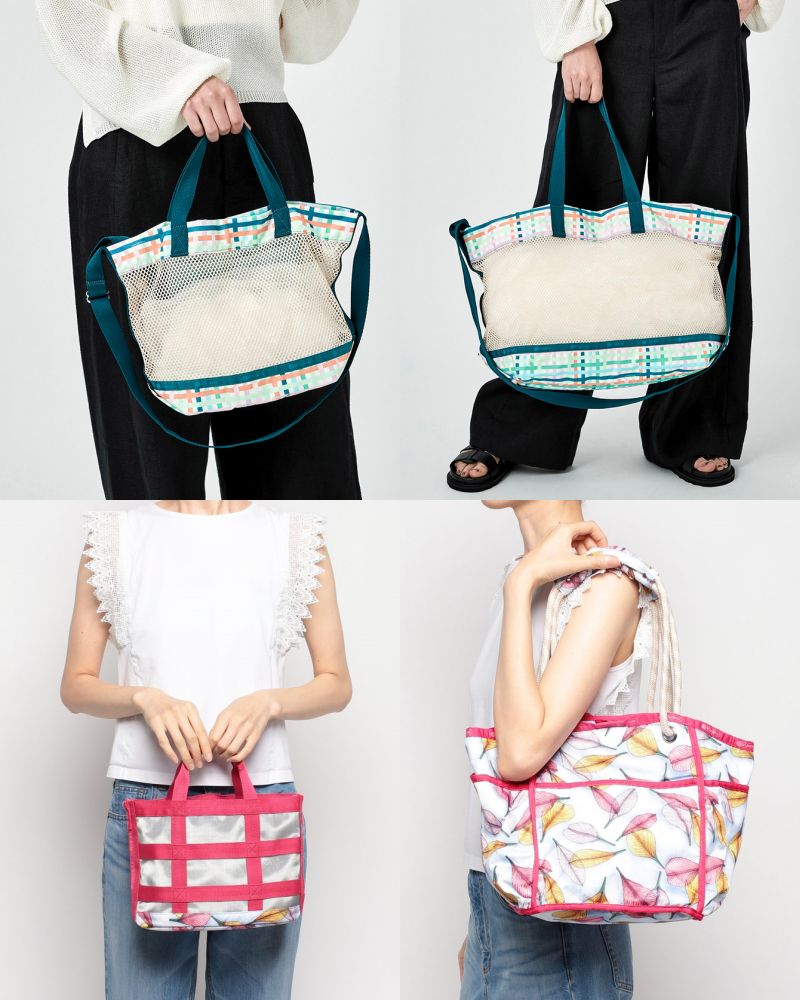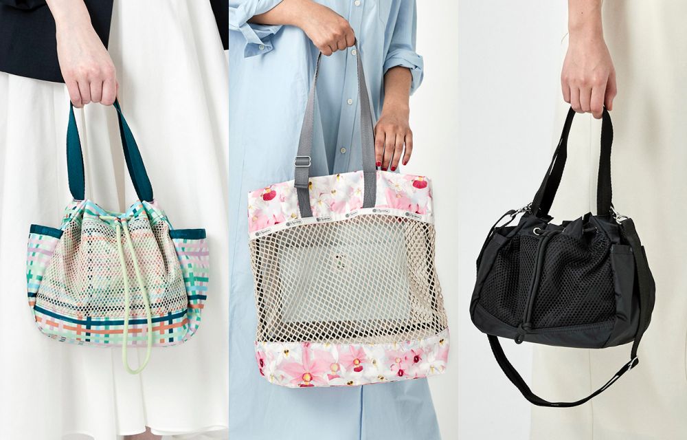 LeSportsac全新透視包以再生尼龍材質拼接網眼布料,結合悠閒百搭的抽繩水桶包與托特包型,打造薄透清爽氛圍,不論是夏日戲水、野餐或戶外郊遊等活動,包款的輕便材質特性加大容量設計,一網打盡防曬、化妝品、泳裝等裝備,絕對是夏日配件最佳首選。
