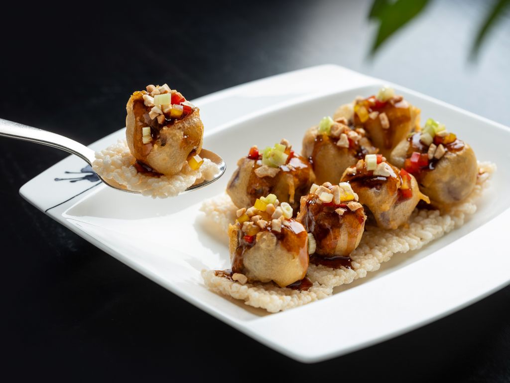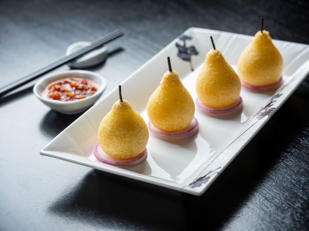 鄭主廚特製港點「經典鮑魚鹹水角」將經典港式點心鹹水角手捏製成精緻吸睛水梨形,在豬肉、蘿蔔乾與五香粉內餡中拌入鮑魚丁,以海鮮鮮甜提味,增添多層次口感。