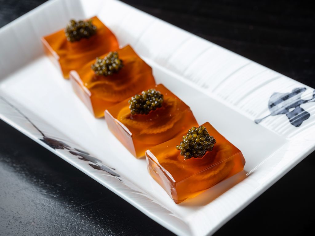 開胃頭盤「魚子醬水晶鮑魚」呈盤吸睛,主廚選用新鮮鮑魚以雞肉與豬肉熬製高湯燜煮入味且口感彈牙,取出放涼再包覆金華火腿、老母雞與豬肉製成的上湯明膠成凍,加魚子醬點綴提味。晶瑩剔透,鮮甜且海味豐富,適合夏季享用。