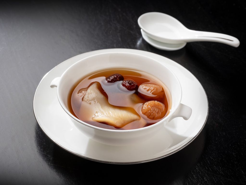 「石斛蟲草花燉花膠」湯品是將金華火腿與老母雞、豬肉燉煮成上湯,再加入燉蟲草花、石斛與花膠煮,最後放入枸杞燉煮,湯頭濃郁清甜,蟲草花增益風味,口感Q彈,膠質豐富,滿是食材精髓的鮮美滋味縈繞在口中。