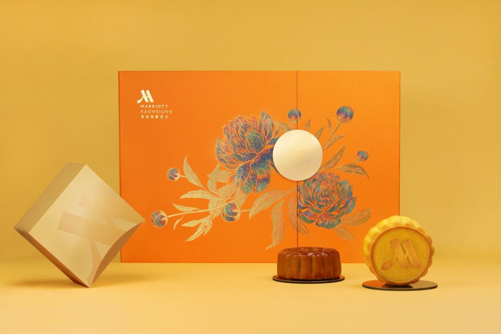 花影映月中秋禮盒結合東方奢華美學底蘊,以亮橙色搭配燙金花卉禮盒設計,點綴孔雀羽毛斑斕配色,輝映一輪霧金明月,高尚典雅又饒富詩意。內含6款蘊含台灣在地食材豪氣廣式月餅,香氣十足不甜膩,滋味濃而不過甜,醇厚中蘊含細緻甘甜。每款月餅皆烙印象徵萬豪酒店(Marriott)英文字母M,質感風雅時尚,送禮豪氣大方。