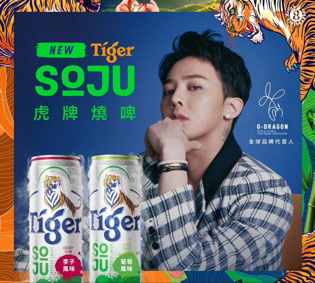 國際啤酒品牌TIGER BEER虎牌啤酒在台推出全新虎牌燒啤,全新虎牌全球品牌代言人G-DRAGON權志龍重磅來襲,TIGER SOJU葡萄、李子2大風味挑戰韓式燒啤的完美比例。