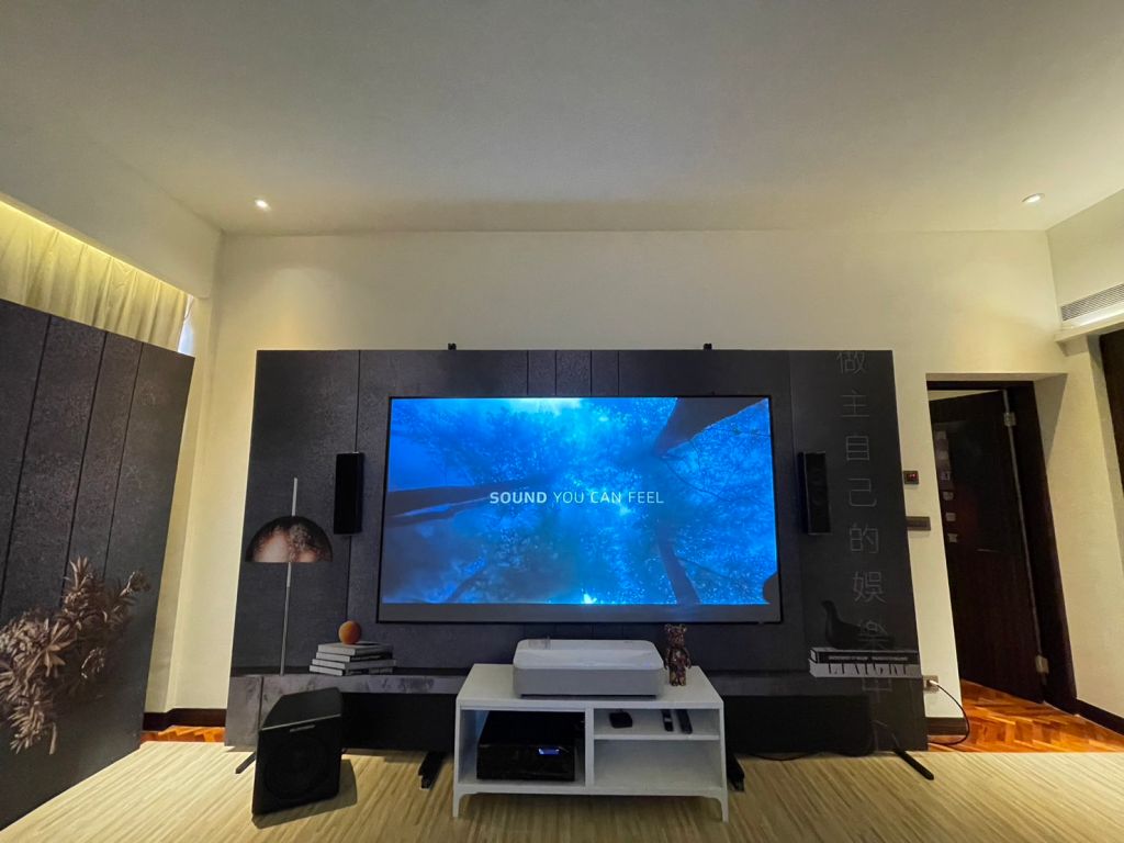 愷銳音響將展房以不同生活情境分區,藉由市面最夯的長焦投影機、雷射大電視等視聽裝置,結合M&K SOUND嵌入壁掛式喇叭,量身訂做專屬私人電影院。