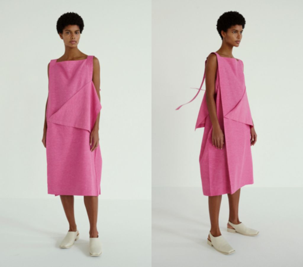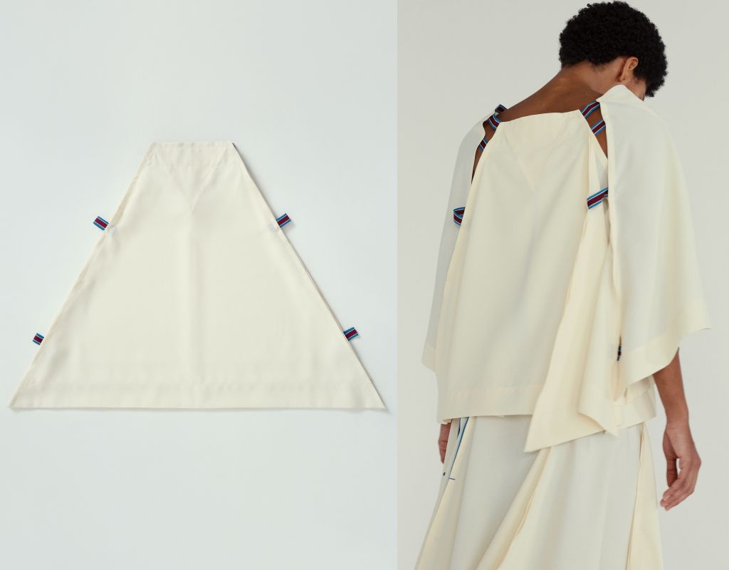 ZOETROPE系列的靈感來自於西洋鏡(ZOETROPE)不停旋轉而形成的小動畫,由多個三角形布面與綁帶組成,垂墜的布面與綁帶營造飄逸輕柔的造型,100%再生聚酯纖維面料,打造出適合夏日的舒適與柔軟質感。