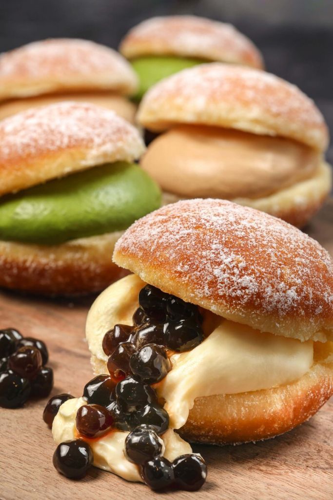 全新甜品珍珠生乳甜甜圈每一口都有爆漿的驚喜,另有抹茶與提拉米蘇2款內餡口味可供選擇。珍珠奶茶戚風蛋糕淋上滿滿黑糖波霸,震撼的視覺效果絕對令所有珍珠控瘋狂。珍奶爆漿可頌造就出外皮金黃酥脆的完美口感,棉花糖珍珠披薩交織出垂涎三尺的多層次滋味,喜歡挑戰創意、嘗鮮無極限者值得一試。