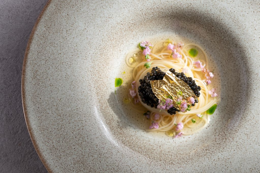 重點菜色「魚子醬與蕃茄澄清湯冷麵」選用義大利貝魯迦魚子醬Caviar Beluga覆蓋如髮絲細膩的麵條Capellini,注入牛蕃茄及黑柿蕃茄製成的澄清湯交織風味,加入芳香萬壽菊及紫蘇花提升香氣,重新詮釋古典食材的迷人風采,及新世代料理團隊的鮮活個性。