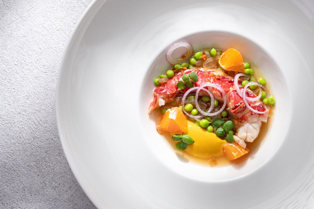 「烤藍龍蝦與日本蜜柑」以日本蜜柑、橄欖油及覆盆子醋調和出微酸甜爽口醬汁,澄亮帶出法國藍龍蝦鮮甜滋味,搭配伊比利臘腸、珍珠豆,及畫龍點睛的蜜柑果肉輕盈勾勒夏天品嚐畫面。