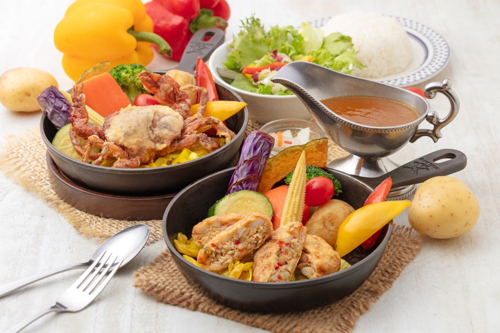 勝政日式豬排、勝勢日式豬排的炸功強項,將軟殼蟹以酥炸料理結合日式炸豬排、無毒蝦排、草蝦的奢華美味;BEPPIN PASTA則將軟殼蟹料理結合義大利麵,呈現和風洋食風貌;泰迪農園咖哩把酥炸軟殼蟹融合到咖哩,展現海潮鮮美的鹹香滋味。
