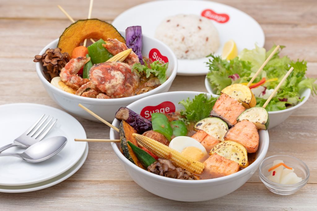 Suage北海道湯咖哩季節美味帶來酥炸軟殼蟹湯咖哩,適合喜愛將酥炸料理浸泡在湯頭裡享用的老饕。串烤味噌鮭魚湯咖哩將切塊的鮭魚菲力、櫛瓜輪番串起,塗抹白味噌後稍微烤製,鮭魚烤串浸泡在蘊藏著十多樣辛香料的湯咖哩底蘊裡,展現鮭魚柔軟、多元風味層次的優點。