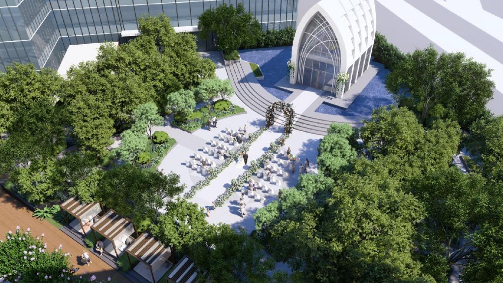 飯店5樓戶外禮堂也打造一處融入天空森林的「秘密花園」,新人可以在如森林般綠意與花欉中完成一場夢幻的證婚儀式與After Party。