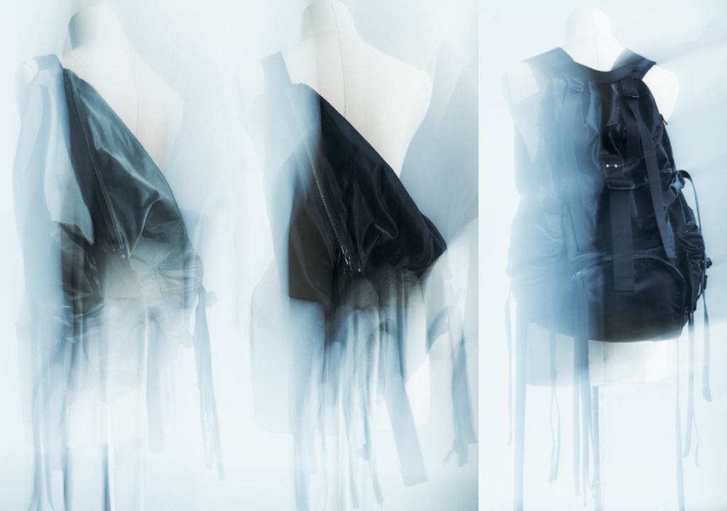 Ground Y以戶外場景為靈感來源,本季推出的後背包款兼具機能與實用性,正面與兩側口袋均設有拉鍊,方便拿取物品,也提供了工裝感的裝飾性。拉鍊上有著像流蘇一條條的飾帶,不對稱的垂墜感呼應山本耀司設計中,隨性又埋藏豐富細節的衝突美感。