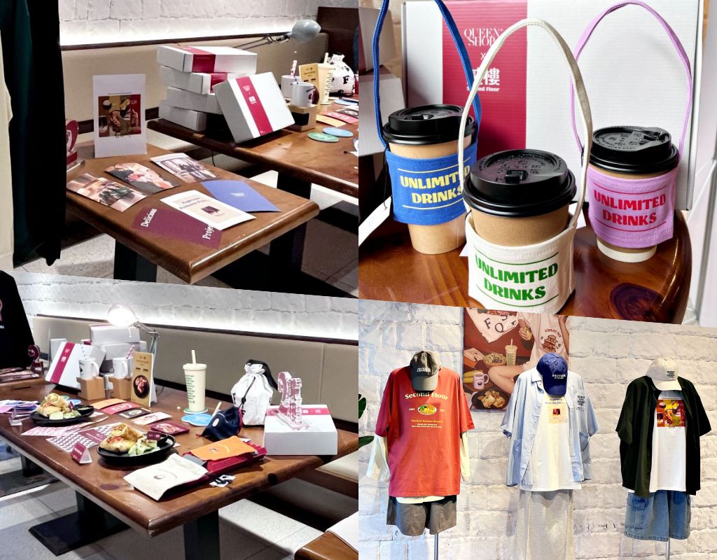 貳樓╳QUEEN SHOP聯名更推出馬克杯、冷水杯、保冷袋、陶瓷杯墊、飲料提袋及野餐墊等多樣聯名周邊,在家中、辦公室、戶外活動,都可以輕鬆擁有美味氛圍相伴。