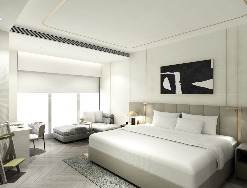 客房採用英國百年名床斯林百蘭與席夢思頂級床墊、Nespresso Vertuo膠囊咖啡機等設備,配置4K智慧旅館電視系統,搭載投影功能、中英日智能語音管家Aiello小美犀整合環控系統,全面提供直覺式、個性化智慧體驗,致力為賓客提升卓越享受。