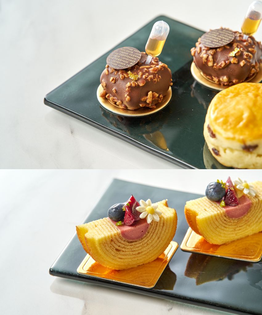「古格霍夫蛋糕」發想自經典古格霍夫蛋糕,打破皇冠造型外觀,製成小巧可愛的一口巧克力方磚,咬下時先品嚐到外層巧克力脆片,接著是中層巧克力蛋糕包裏著巧克力甘那許,嗜甜者不妨拿起特製楓糖醬滴管動手裝飾蛋糕,滿足視覺與味覺的有趣體驗。