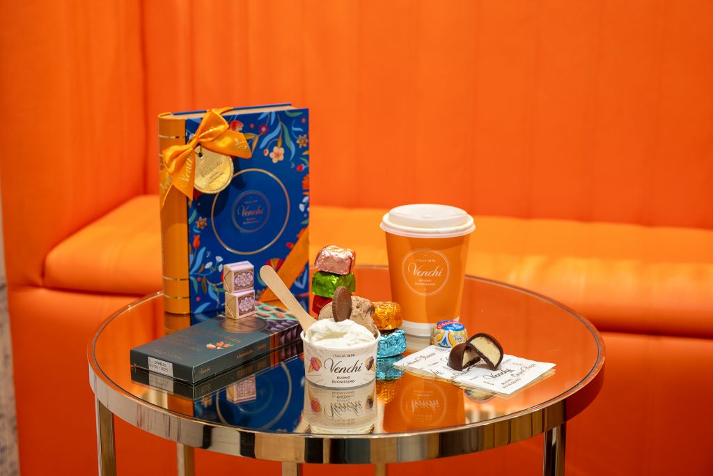 全台獨家魚子方牆整齊排列著Venchi創意巧克力系列,看著便覺療癒舒心。逛累了,有座位區可以稍作休憩;口渴了,一杯咖啡搭配巧克力在舌尖完美邂逅;午后明媚,咬一口Gelato感受遙遠古城的熱情盛夏。
