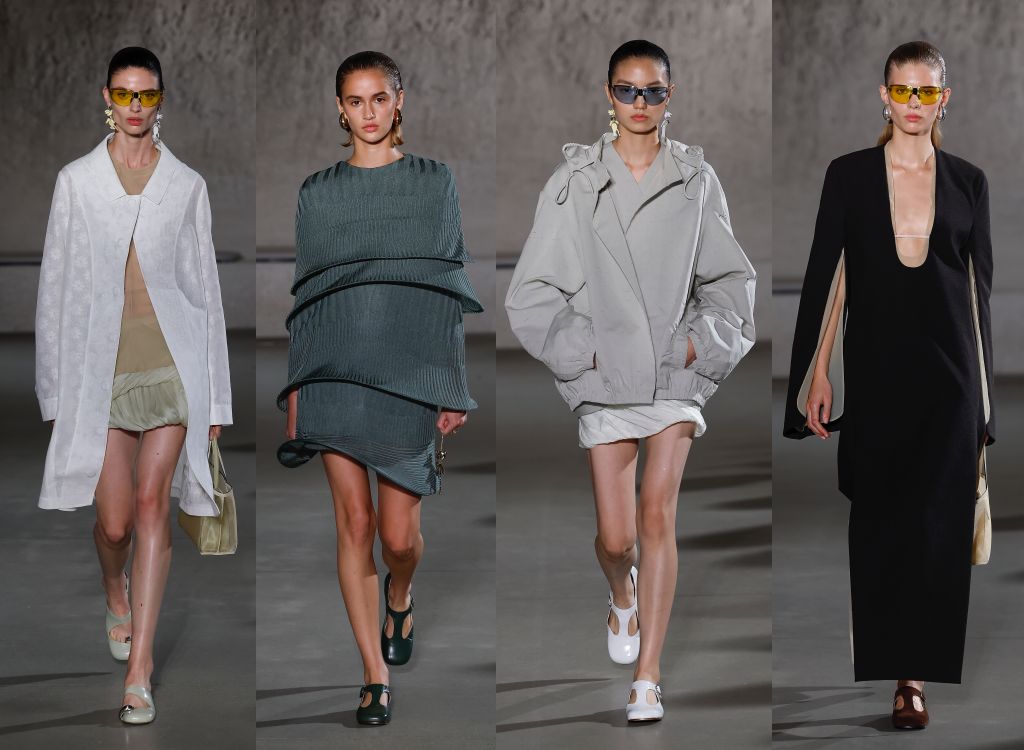 服飾廓形大多由織物構建,而非結構或填充物。風衣及U領迷你洋裝採用棉絲山東綢,經過壓碎與熱封處理,形成柔和隨性的形狀。