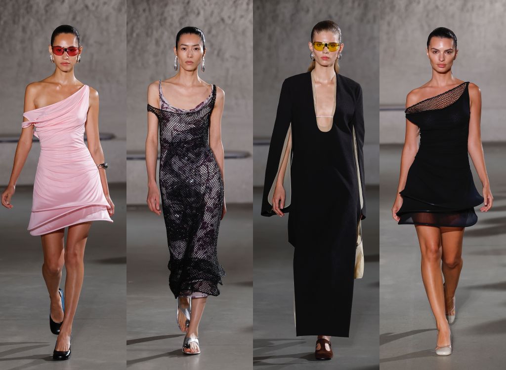 材質從輕盈的歐根紗、尼龍塔夫綢、鉤針編織布、針織面料到黏合氯丁橡膠、彈力縐紗及閃亮的剪裁針織布,各種材料仿佛輕若無物。