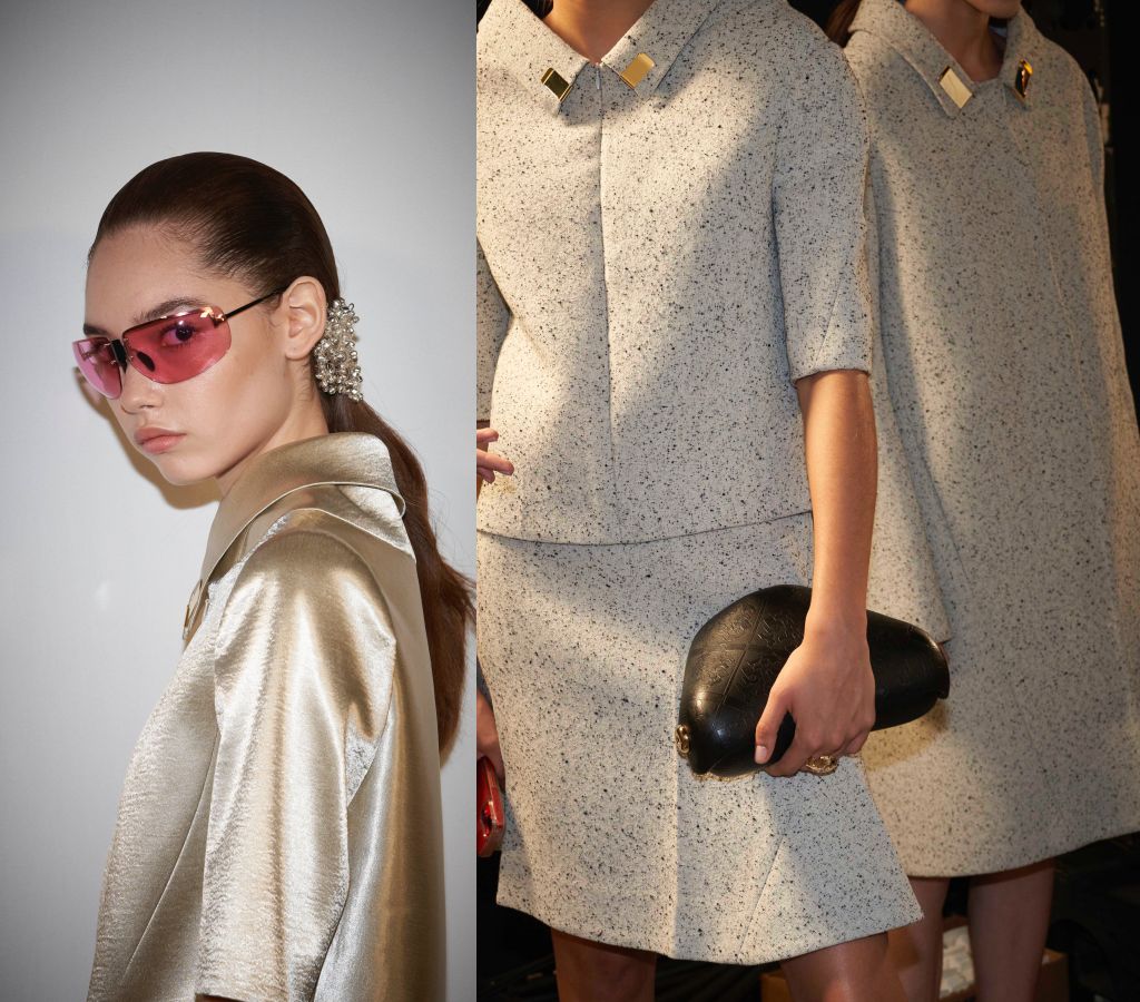 簡潔幹練的廓形藉由精心設計細節得到煥新演繹。西裝外套與束腰上衣採用弧形線條設計,袖子飾有裂口露出部分肌膚,營造優雅動態美。洋裝與半身裙採用垂褶與束結設計,力求突出服飾自然形態而非廓形。