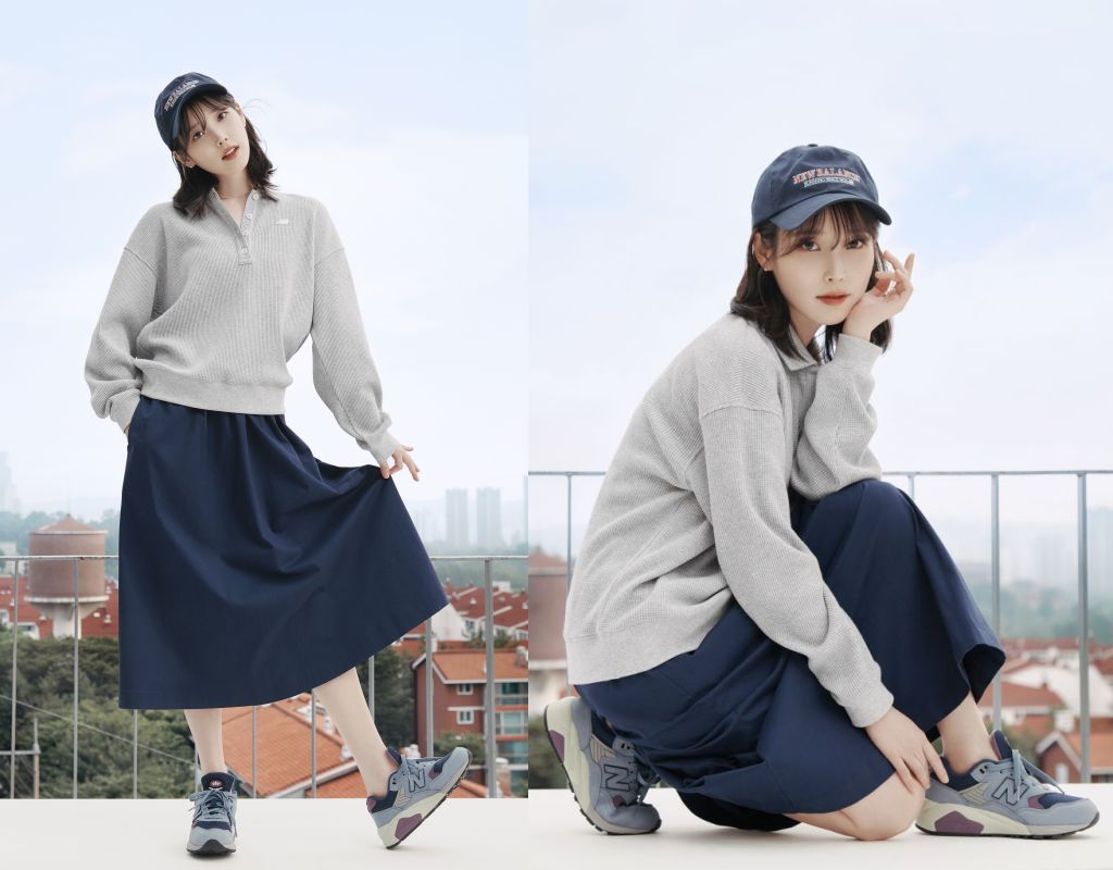 IU李知恩身著NB ATHLETICS系列灰色長袖上衣與同系列深藍色抽繩長裙,充分體現中性色調的簡約百搭。上衣採用親膚性高的華夫格布料,搭配輕盈且立挺的長裙點綴,優雅自得卻不失氣場。