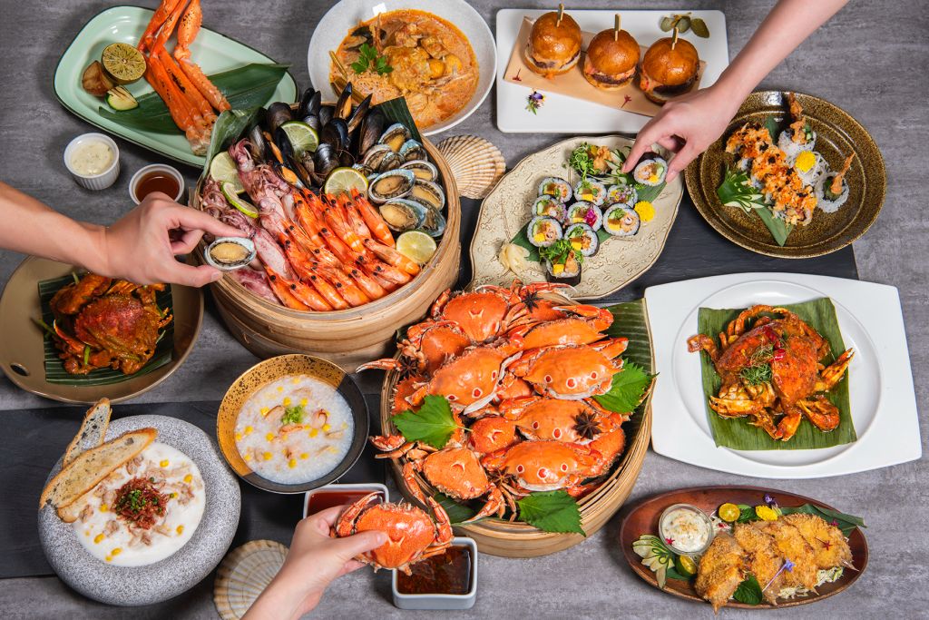 主題餐檯推出澳洲和牛與各式秋蟹料理等豐富美饌,包含現切爐烤澳洲和牛、創意滿點的迷你龍蝦蟹沙拉牛肉漢堡、帶南洋風味的軟殼蟹叻沙湯麵、墨西哥特色蟹肉酪梨手捲、清蒸藍蟹、什錦海鮮佐紐奧良香料醬與泰式酸辣醬等極品海陸美饌,澎派吃到飽,滿足饕客味蕾。