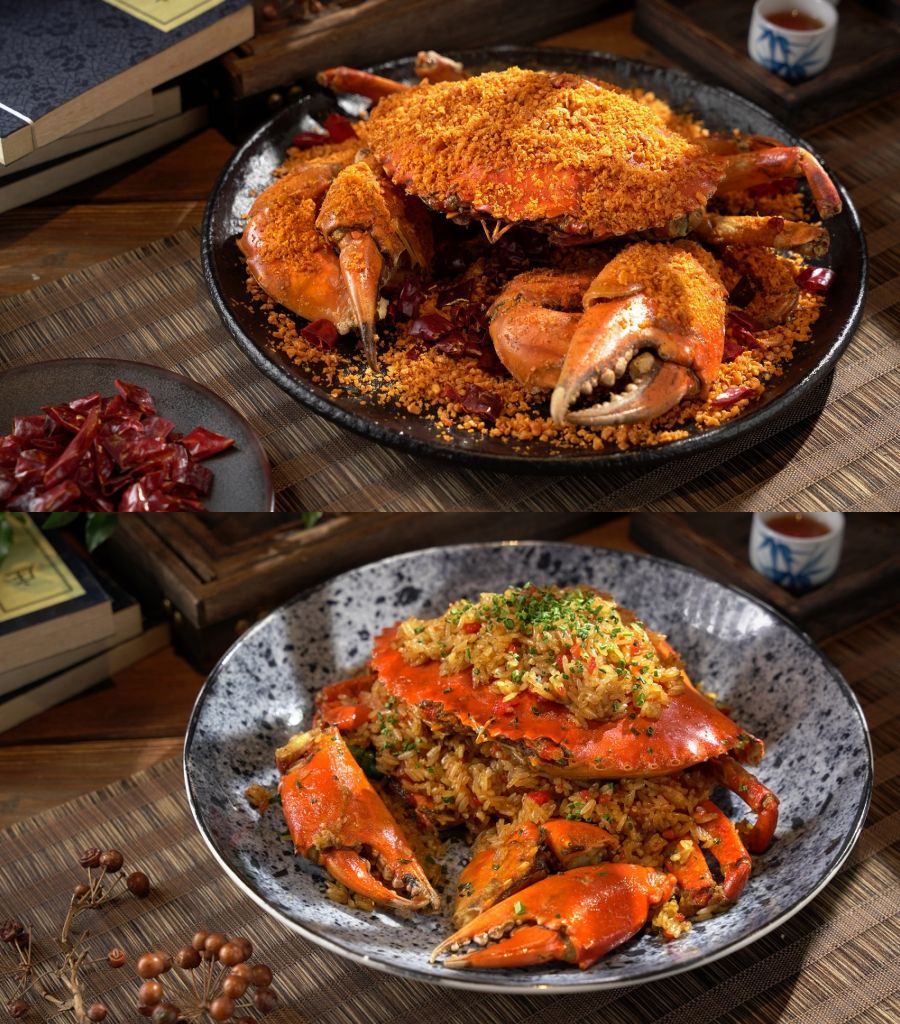 沙母粉絲煲選用擁有濃郁蟹黃及蟹膏的沙母,濃郁滋味讓舌尖沉浸在幸福的味覺中。油鹽焗處女蟳蟹膏豐腴,尾韻帶著馨香,享受蟹膏的油潤鮮美。加拿大重量級黃金蟹花雕酒蛋蒸黃金蟹,入口帶有溫潤沁人酒香。