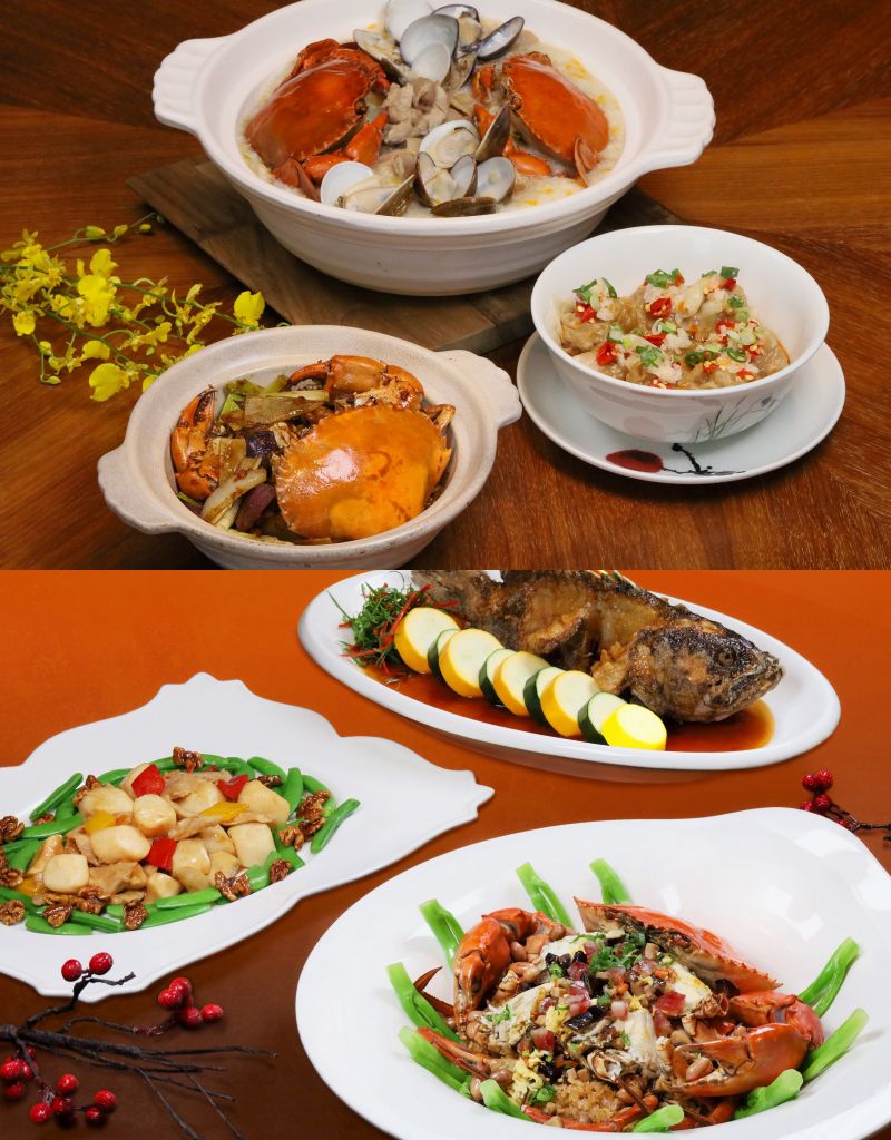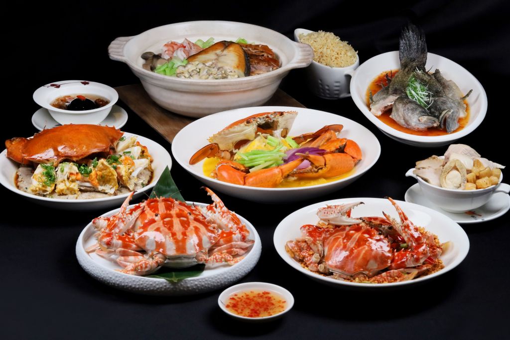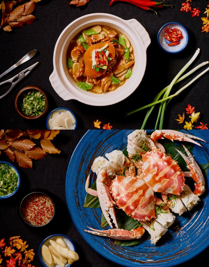 廣東潮州秋季必吃的經典料理老饕潮州凍花蟹、香港極具特色的螃蟹料理橋底避風塘花蟹、鮮甜蟹汁混合濃郁肉汁的虎門蟹餅蒸沙母、及口感細緻滑順的黃金流沙焗沙母,另提供油浸檸檬筍殼魚及川貝雪梨燉鮑魚等共10道單點佳餚,豐富味蕾層次。