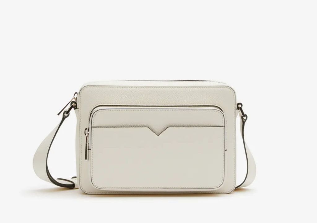 V-Line記者包將VALEXTRA與時俱進的都市工藝與工程美學相融合,輪廓構造層次分明,可肩背或斜背,亦可用作手拿包使用。包身採用羊皮紙白Millepunte小牛皮製作,外部拉鍊隔層飾有標誌性V形開口,透過微妙細節彰顯獨特個性。