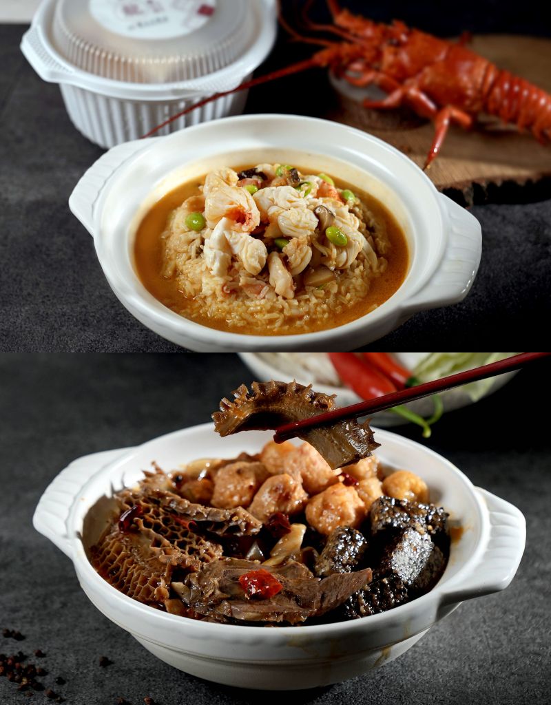 龍蝦海鮮泡飯湯底風味鮮甜濃郁,蝦肉鮮脆彈牙;上桌後將炸好的酥脆香米,傾瀉而下至滾燙的龍蝦海鮮湯,爆穀聲滋滋作響,香氣四溢,結合聽覺、嗅覺、味覺的功夫菜。麻辣車仔滷為金龍餐廳獨門無添加料理,湯頭香麻溫潤、辛香十足、料多實在,口感層次交疊;還可隨心加入喜愛的科學麵等食材,在家就能開吃星級鍋物。