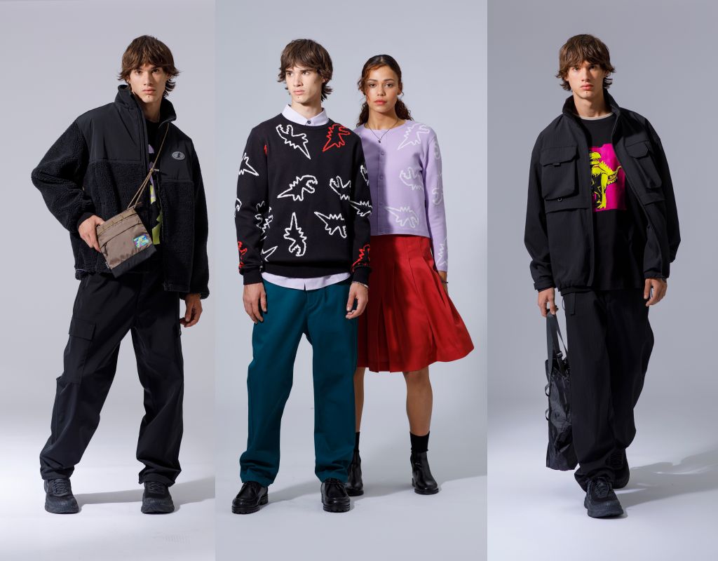 為傳達新世代與數位世界的緊密串連,將恐龍與伴隨的星星與閃電等圖樣,以影像格放後的彩色印刷效果呈現。男女裝針織毛衣的經典款滿版恐龍圖樣,秋冬推出黑色與薰衣草紫2種色選,對比強烈視覺印象,為造型注入青春活力。