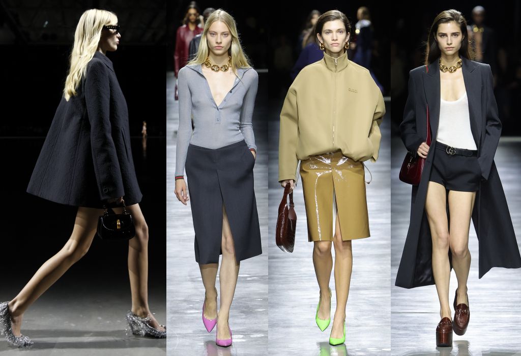 超長風衣、超低背心、極短褲、厚底樂福靴等造型,呈現簡單親民調性。合身略寬鬆的粉色、海軍藍色長外套或雙排扣西裝,柔軟棉質高領美式風格外套搭配皮裙,修飾腿部修長輪廓線條的極短褲,展現GUCCI女性的幹練俐落、實穿親切一面。