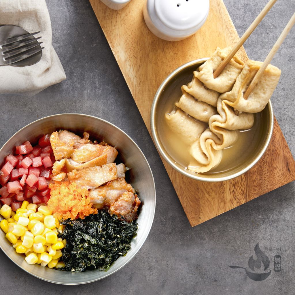 還可到自助吧取用白飯、韓式原味炸雞塊、火腿、海苔等配料,放入碗中就能自製個人份炸雞奶油飯,店內還有韓式炸雞,不定期輪流供應各式口味,皮酥肉嫩,令人忍不住吮指回味。