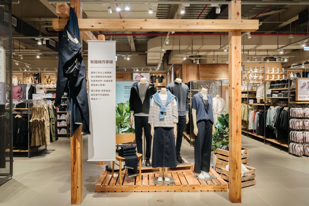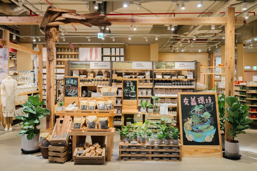 門市裝潢與農業部林業及自然保育署合作,引進國產木材作為裝潢與陳列道具素材,透過實際環境的呈現認識國產材,使用的木材都是可再使用的疏伐木林,透過MUJI無印良品再利用,讓疏伐木材有繼續延伸的使用價值。