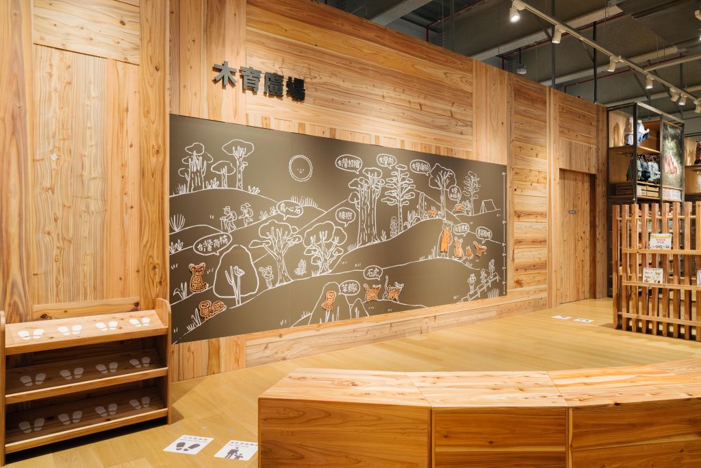 MUJI無印良品還邀請曾經獲得波隆納插畫展的插畫家,在木育廣場的牆面畫出台灣不同海拔的特有林種與保育類動物圖案,希望透過童趣畫面加深孩童認識台灣的山林環境及理解保育的重要性。