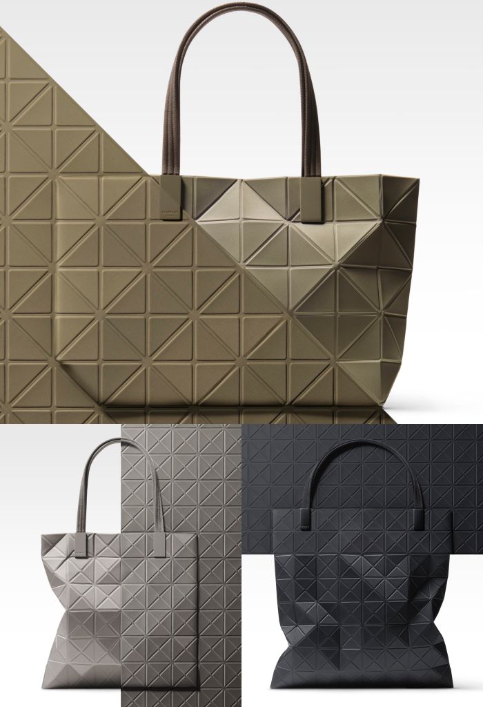 BAO BAO ISSEY MIYAKE結構即輪廓,透過獨有1:1.618黃金比例三角片,創造出融合數學公式與美感基礎的趣味時尚,在突破平面與立體的界線中展現各種可能,單色的極簡讓搭配更多元。三角形為基本,組織成四邊形,透過三角片組合,滿足所有需求的包包大小與形狀,傳遞一塊布的魅力。