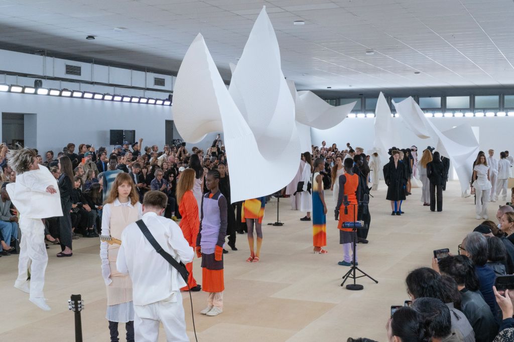 本季大秀來自於跨領域的探索體驗。秀場飄逸的大型縐褶布料由自然纖維製成,輕薄的在空中漂浮,與舞者、音樂家的表演結合為一件美麗的作品,展示服裝與穿著者之間密不可分的關係。