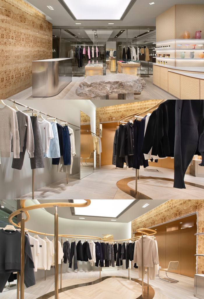 首先映入眼簾的是整片樹瘤的木紋牆面,使用鋼琴烤漆呈現亮面光澤,店內中間圓弧流線形狀衣桿貼近自然概念,木作皆以手工製作。客椅是建築大師Mies van der Rohe設計的60年代經典椅款B42/1 Chair,茶几為台灣品牌Esalia的Edge Table,更衣室中松木小圓凳是丹麥家居品牌FRAMA的AML STOOL。