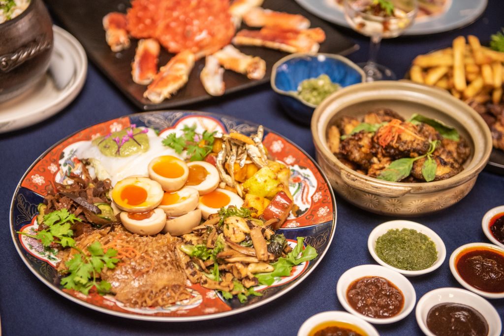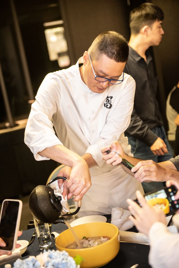 王祥富師傅以日式及中式料理為基礎料理烹調,設計冬味鰤魚刺身、冷盤亦承六味、亦承琉璃豆腐、亦承風味手撕雞、三杯極鮮鮑魚、橙酒炙燒南洋串、六味川燙時蔬、北海道鱈場蟹腳佐山葵、山葵洋蔥牛小排、山葵日式炊飯及湘風魚生湯11道菜色,滿桌料理皆使用亦承6款醬料製作。