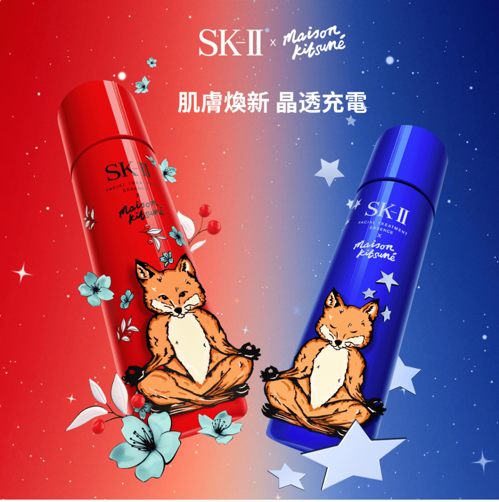 2023年末最療癒聯名驚喜上線!SK-II與MAISON KITSUNÉ時尚小狐狸首次攜手合作,肌膚煥新,晶透充電,迎向生活的冒險。