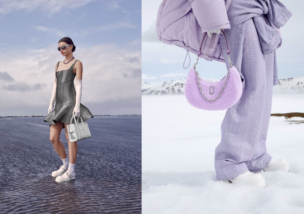 MARC JACOBS在冰島南部拍攝秋冬形象照,模特兒穿著秋冬服飾踩著黑色沙灘,背景襯著覆蓋皚皚白雪山景與浪花激盪絕美冰川,透過攝影師Nick Newbold鏡頭,蓬鬆與流動線條設計的秋冬服飾層疊穿搭,與壯觀山巒冰河交織成迷人的視覺饗宴。