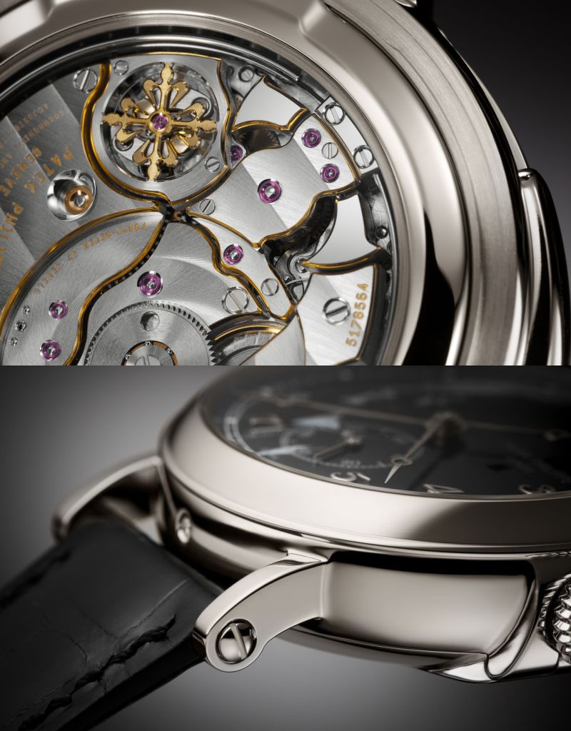 透過藍寶石水晶錶殼底蓋,可以細賞RAL 27 PS新款自動上鍊機芯精巧的加工細節,夾板橋削角邊緣與敲錘經過鍍金,22K黃金鍍銠迷你擺動陀展現黃金邊緣,由人手刻上菲臘斯特恩黑色塗漆簽名式樣作點綴。亮麗黑色鱷魚皮錶帶搭配鉑金摺疊扣,高貴優雅,佩戴舒適。
